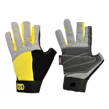 KONG ALEX Segelhandschuh mit 3 offenen Fingern. Hochwertige Wildlederhandschuhe mit DuPont™ Kevlar® Verstärkungen am Handballen und Fingern. Elastisches Handgelenk mit Klettverschluss für leichtes An- und Ausziehen. Elastische Rückseite aus atmungsaktivem und abriebfestem Nylon.