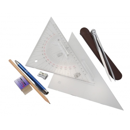 Enthält Marinezirkel, Kurs- und Anlegedreieck PN65 und PN67, Bleistift, Radiergummi, Anspitzer und Kugelschreiber. Lieferung in Tasche.