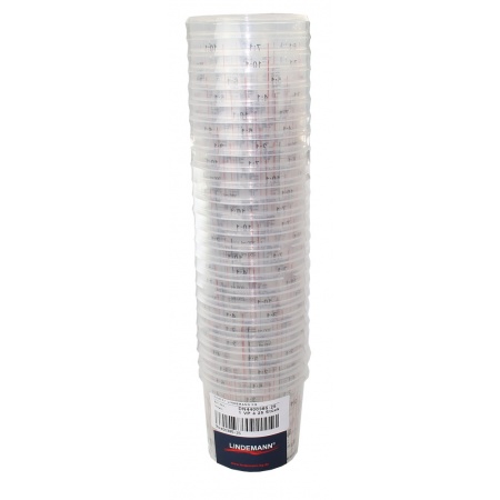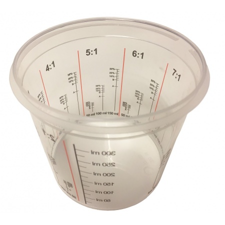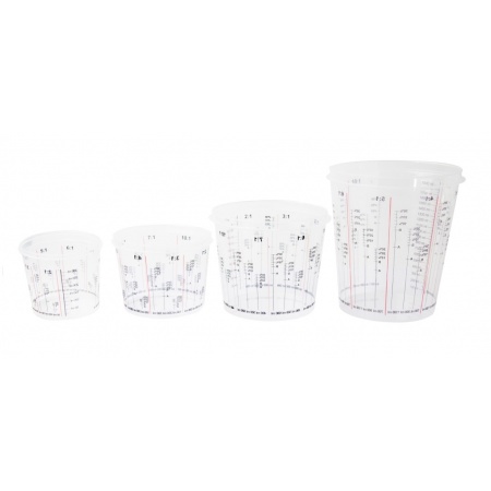 Transparente Mischbecher mit praktischen Mischskalen für 2:1 bis 7:1 Verhältniss.