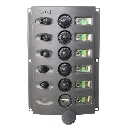 Schaltpaneel hergestellt aus einer Nylonplatte mit 5 Kippschaltern und 5 Schutzschaltern und 1 USB-Ladeanschluss (3x ein-aus 10 Ampere, 1x ein-aus-ein 5 Ampere, 1x Taster ein-aus 5 Ampere z.B.Signalhorn, 1x USB-Ladeanschluss). Für Innen- und Außeneinsatz. Versenkte Schraubenlöcher. Permanente grüne LED-Hintergrundbeleuchtung für Etiketten. Die rote LED leuchtet, wenn der Schaltkreis eingeschaltet ist.