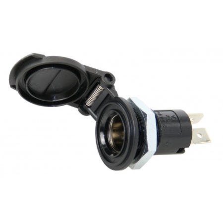 Einbau Normsteckdose mit Deckel zum Schutz vor Staub und Spritzwasser. Passend für Norm- und Universalstecker (12 mm). Einbauloch.Ø 16mm, Gewindelänge 8mm.