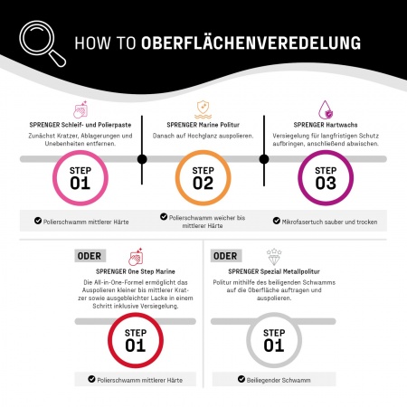 With the SPRENGER One Step Marine, you can completely restore your paintwork in a single step. It is suitable for gelcoat, painted surfaces, metal parts, and smooth sealed wood. The innovative formula refreshes faded paintwork, removes small to medium scratches and sanding marks up to 2500 grit, and creates an almost hologram-free surface. High-quality micro-polymers seal the paint for long-lasting protection and give it a deep shine - no additional sealing is necessary.