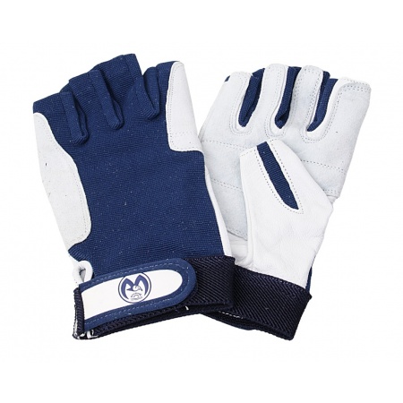 Grip Section made of real leather. Back of the hand is equipped with blue tensile fabric. The highly stressed parts are equipped with double-stitched seams. 5 fingers open.