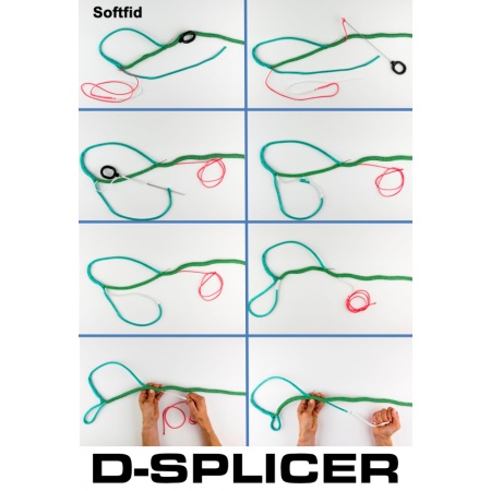 The D-SPLICER Soft Fid is the solution for all splices with doublebraided ropes, where traditional drawing- or hollow needles do not work properly. Especially with modern, very tight woven ropes such as RunnerTwin, you often reach the limits of the metal needles. The Soft Fid is a white sheat braid and a coloured hollow braided rope made of Dyneema®. To splice them put the rope plug end to the end of the white sheat braid of the Soft Fid. Use a thin splicing needle to pull the coloured end of the Soft Fid through the long part of the rope. Now pull firmly at the coloured end of the Soft Fid that the white sheat braid with the plugged rope end is pulling through the rope.