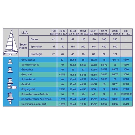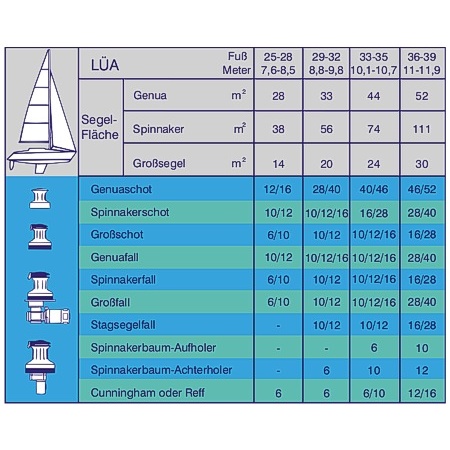 Um Segeln voll genießen zu können, ist es erforderlich, daß Sie die Winden für Ihr Schiff nach den richtigen Kriterien für die Größe Ihrer Yacht und Ihren Anforderungen auswählen. Die nachstehende Tabelle ist ausgelegt für topgeriggte Einrumpfyachten von mittlerer Verdrängung. Für eine 7/8-getakelte Yacht empfehlen wir, die Segelgröße bei der Auswahl der Winde heranzuziehen und nicht die Länge der Yacht. ULDB-Boote können kleinere Winden verwenden, schwere Boote dagegen sollten etwas größere Winden einsetzen. Für Katamarane und Trimarane werden generell größere Winden benötigt aufgrund des hohen aufrichtenden Momentes.