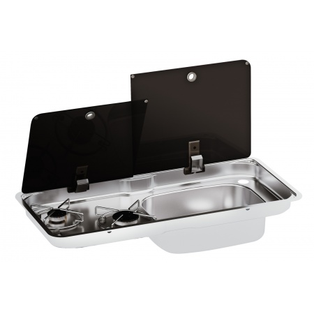 Rectangular gas hob-unit with 2 burners and with rectangular sink, waste and rubber seal included. Made from stainless steel, 2-burner gas supply, equipped with rectangular sink, stainless steel support grid fixed with anti-vibration grommets. Double lid in tempered black glass, divided between cooking area and sink, with concealed hinges.